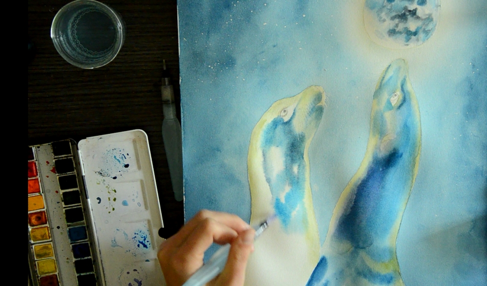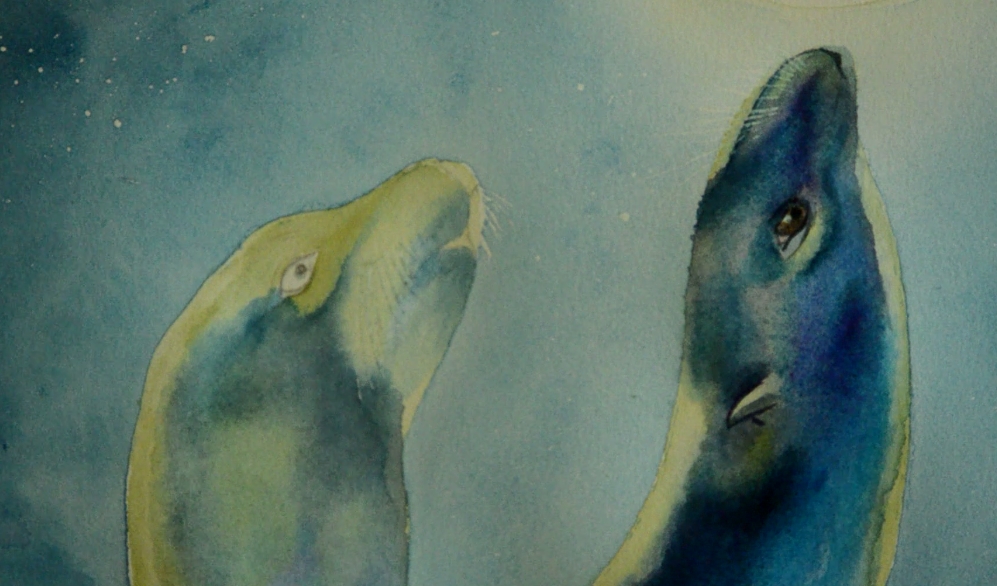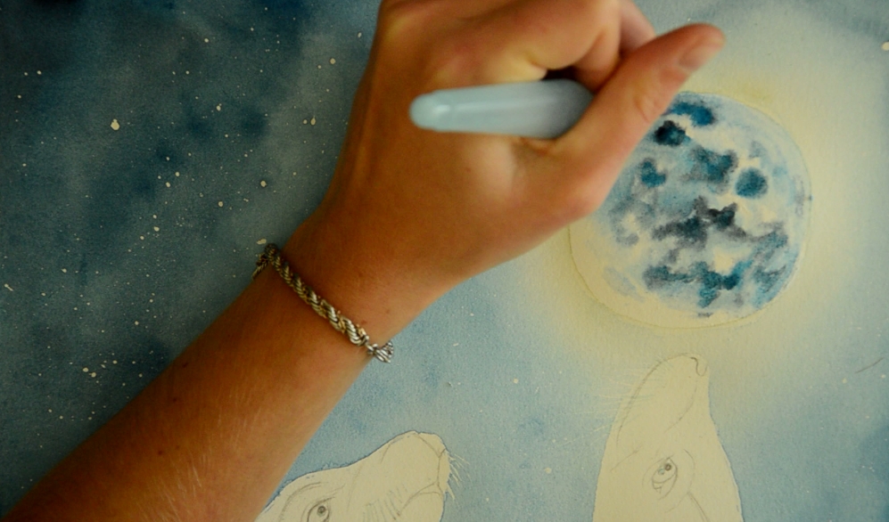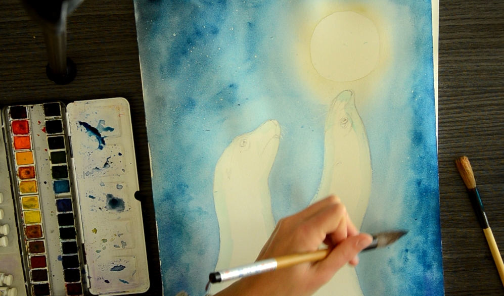 J’ai projeté du liquide de masquage sur mon papier en cachant mes otaries pour créer les étoiles. J’ai masqué également les bordures des otaries pour que le fond ne déborde pas sur elles et qu’elles s’en détachent bien. Une fois le liquide sec, j’ai mouillé le fond du tableau et appliqué beaucoup de bleu de prusse en créant un dégradé qui s’éclairci en approchant de la lune, et dans une moindre mesure des otaries. J’ai aussi utilisé du gris de Payne et une touche de violet winsor sur les bordures les plus foncées. Toujours sur papier mouillé, j’ai passé un vert olive tout autour de la lune (très dilué) pour créer cette lumière si particulière.