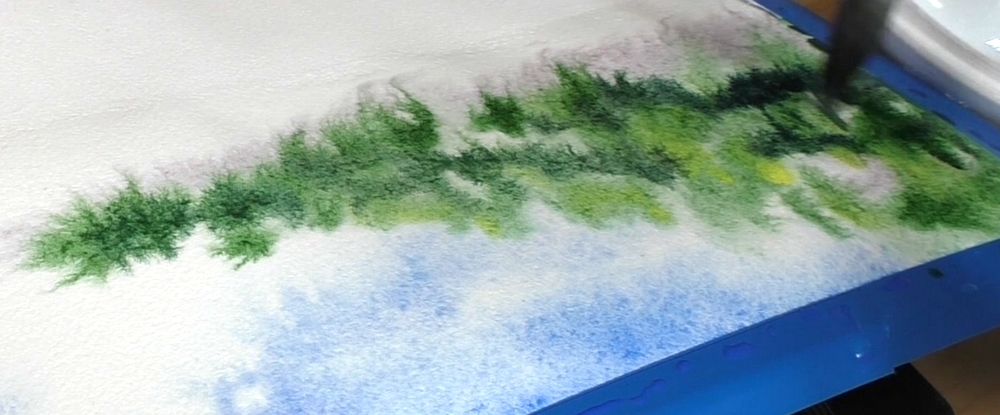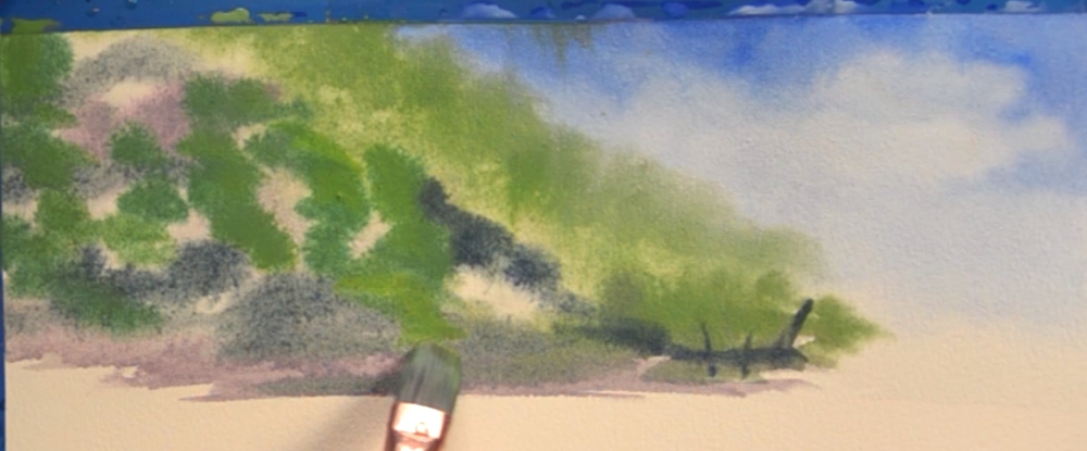 La colline est un camaïeu de verts associé au gris des rochers. J’essaie d’employer des teintes similaires mais le traitement de la végétation n’est pas du tout le même, à chaque peinture sa technique pour essayer de donner un aspect touffu :