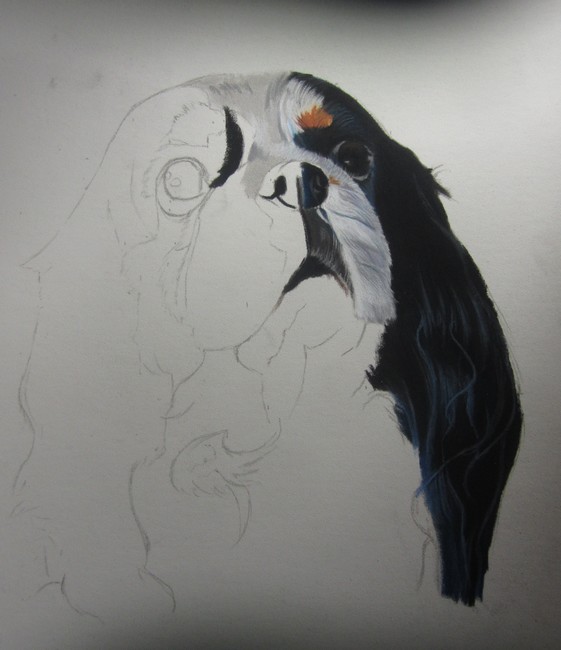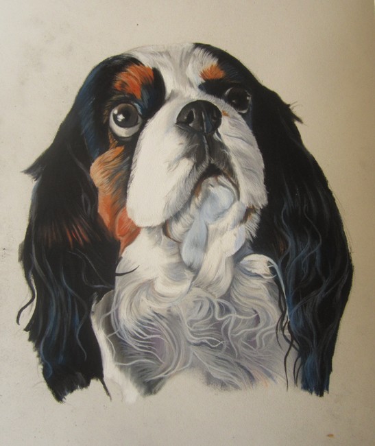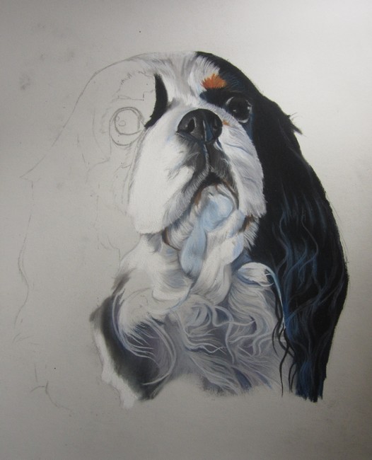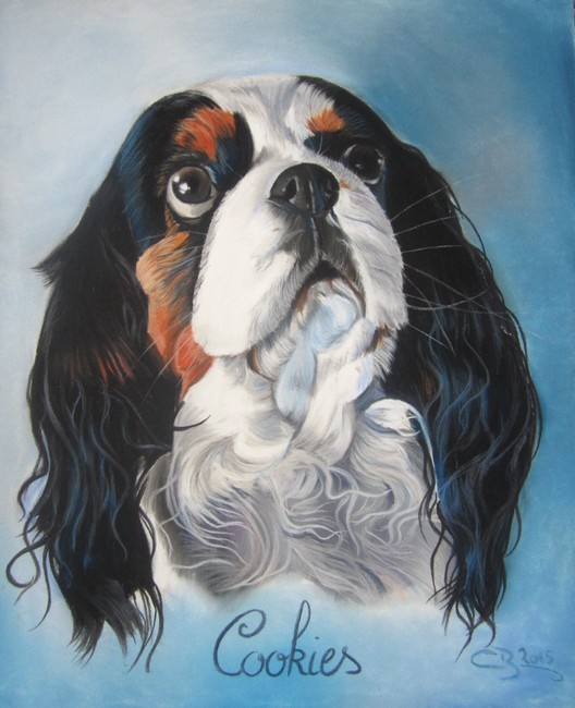 Aujourd’hui je vous présente miss Cookies ! Trop choupinette la petite chienne 🙂 Malgré un modèle un peu flou j’ai bien aimé faire ce portrait… Je ne sais pas si vous vous souvenez du portrait de Spike, un autre Cavalier king charles aux pastels sur fond bleu. Il a beaucoup tapé dans l’oeil de Vanessa, qui a décidé de passer commande pour ses parents. On est donc parties sur un fond bleu, mais je l’ai fais tout de même dans des tons différents pour mieux coller à la photo de modèle qui était très contrastée.