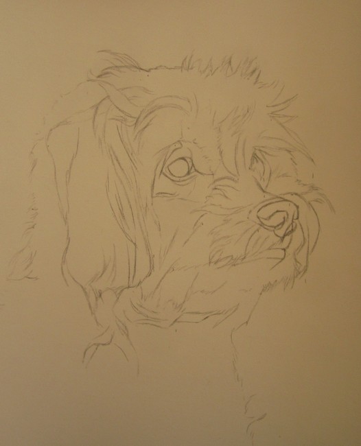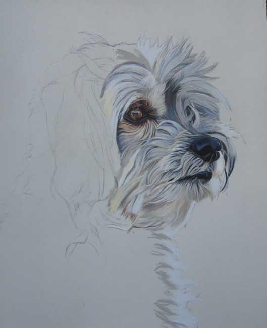 Voici donc ma petite esquisse, sur Pastelmat blanc (ce n’est pas flagrant à cause de la lumière légèrement affreuse de mon salon). Ce n’est pas très facile de s’y retrouver avec les toutous très poilus, car ils ne nous offrent pas beaucoup de points de repère.