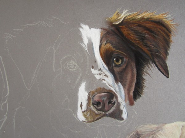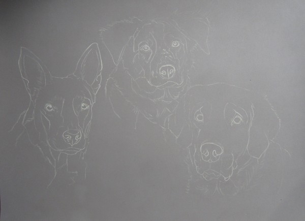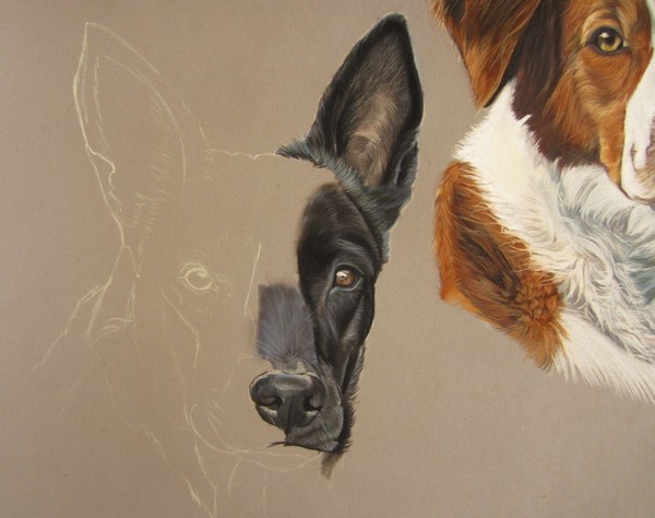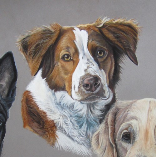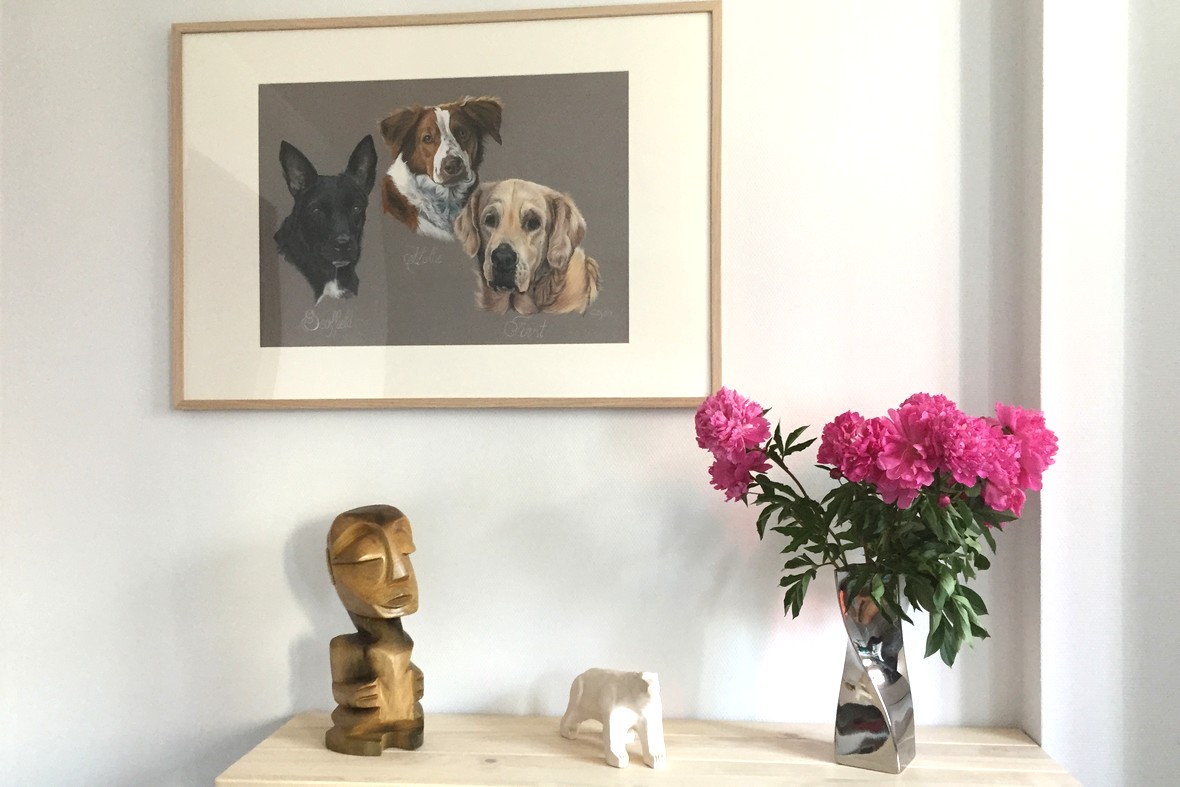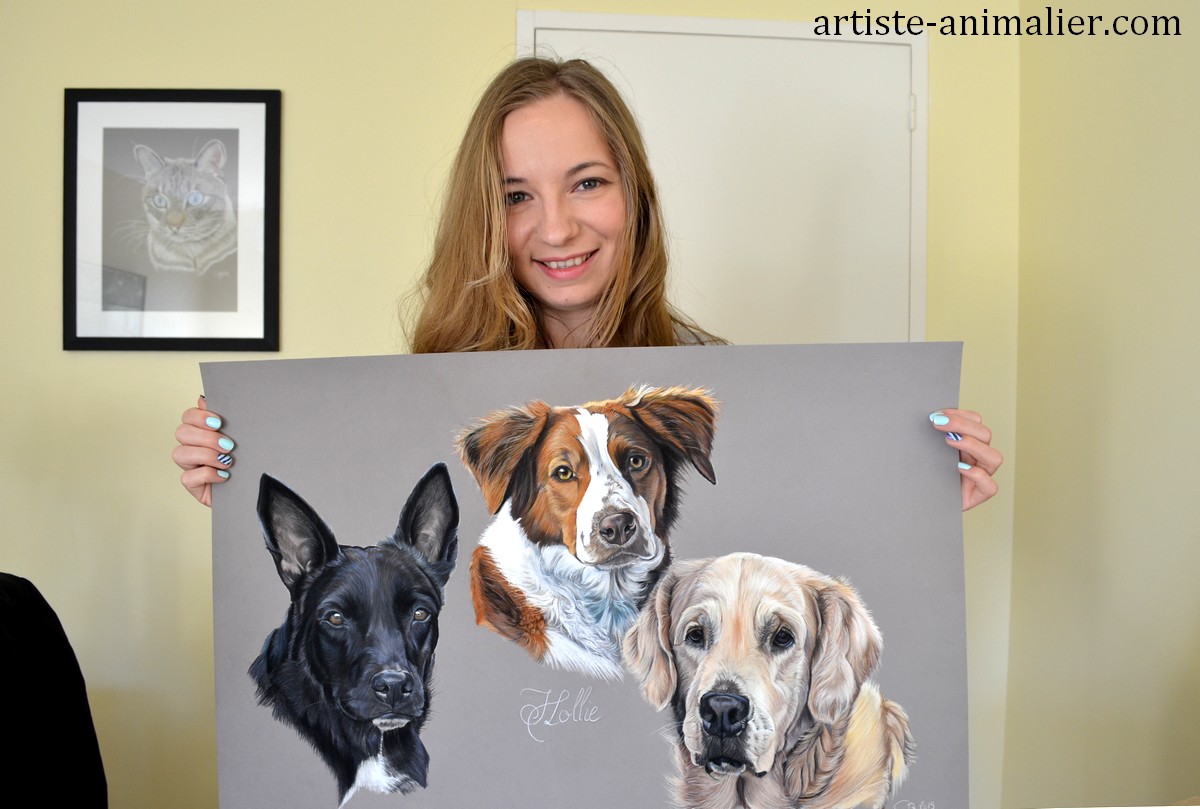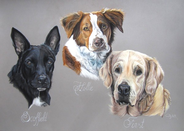 J’arrive dans une période où j’ai beaucoup de grands formats, pour moi c’est un grand plaisir de travailler sur des compositions avec de multiples sujets ! Comme ce triple portraits des trois chiens de Céline : Scoffield, Hollie et First. 50*70cm de toutous, très différents les uns des autres et tous les trois bourrés de charme.