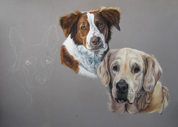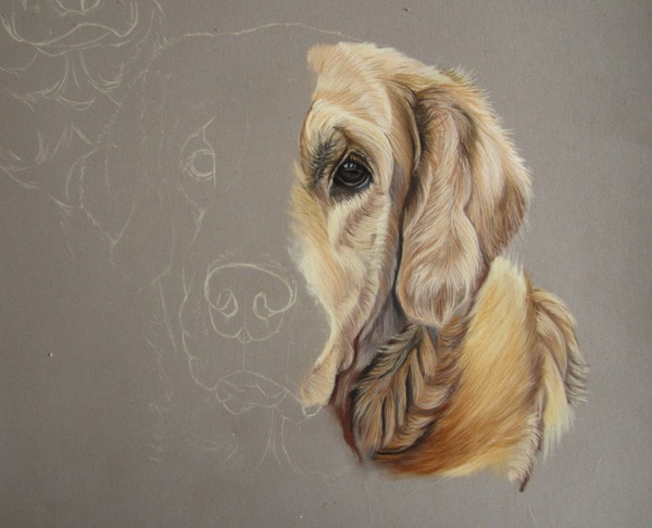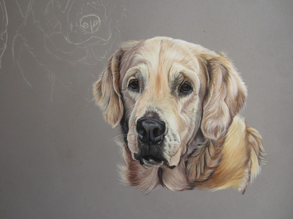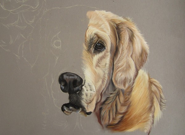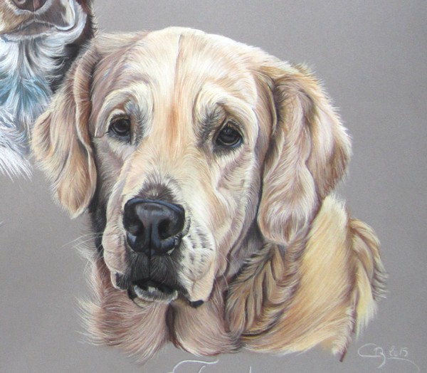 Honneur au Golden Retriever First, non pas parce qu’il s’appelle First mais parce que je suis gauchère et que c’est plus pratique pour moi.. J’ai vraiment adoré faire sa bouille. Sa robe est très claire avec un poil très soyeux que j’ai pris plaisir à reproduire. Beaucoup de bâtonnets ont été utilisés, et ce qui est rigolo c’est qu’il y a une quantité non négligeable de rose dans ce portrait 🙂 Alors ça ne saute pas aux yeux car ça intervient dans le mélange des pigments, mais la couleur chair m’a beaucoup aidé à obtenir sa robe sable.