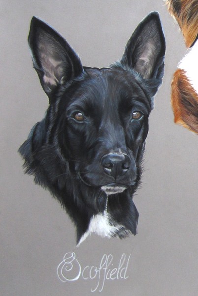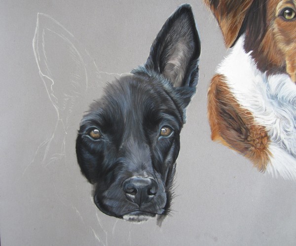 Et le petit tout noir, Scoffield, qui a beaucoup de reflets très luisants.. Je commence par l’oreille et je descend vers l’oeil et le museau. Je travaille par couches de pastels successives pour créer d’abord la teinte principale puis le reflet par dessus.