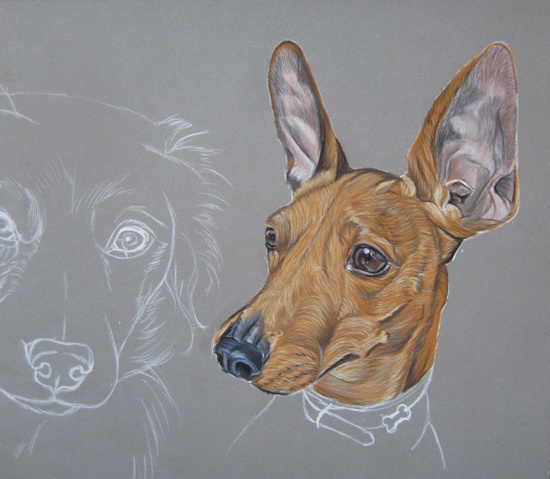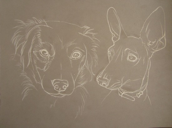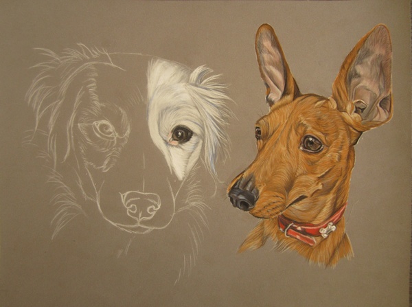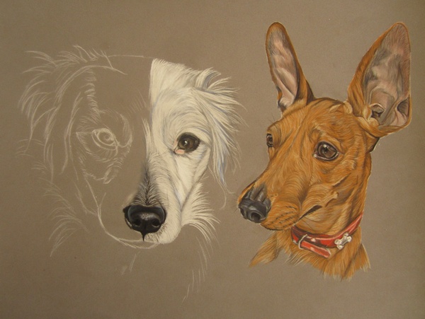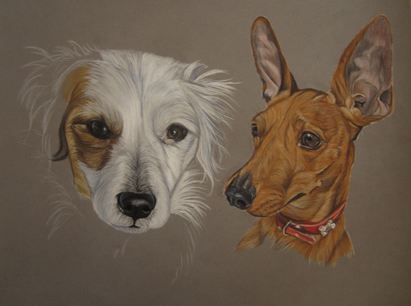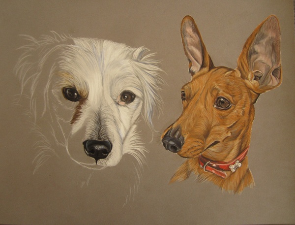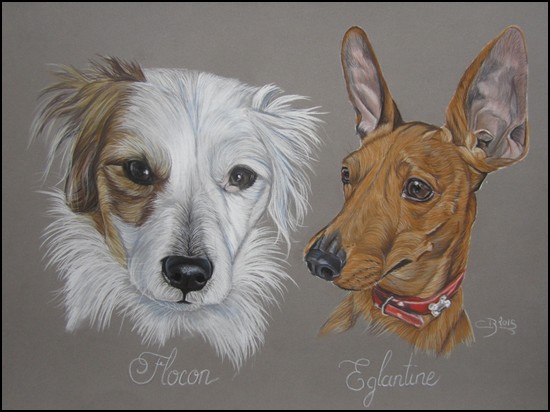 Voici le dernier tableau commandé par Catherine, après ses chevaux, ses chats aux pastels, il s’agit de ses deux jolis chiens Flocon et Eglantine.