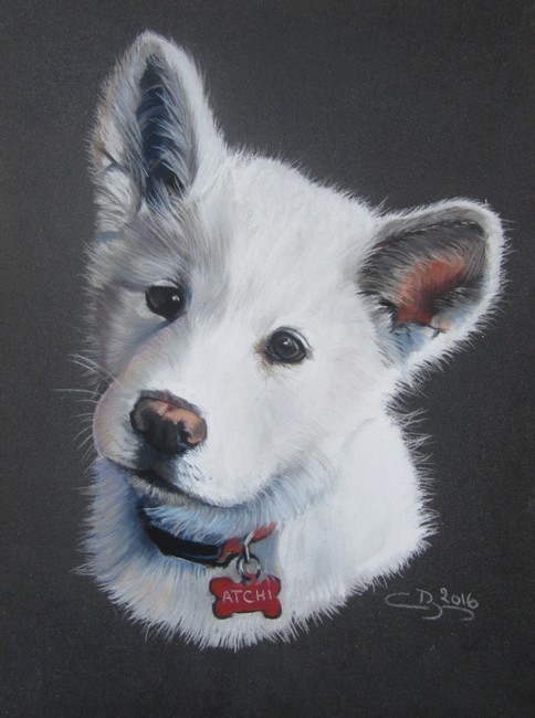 Un petit chiot à immortaliser, c’est un bonheur ! De grands yeux expressif et un pelage de coton, c’est à la fois adorable et très intéressant. Le portrait de cette petite Atchi m’a été commandé par Lara, il s’agit d’un chiot Akita Inu tout blanc. Un exercice à double intérêt si vous débutez le pastel sec : poil cotonneux, et poil blanc.. !
