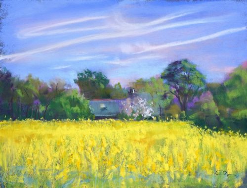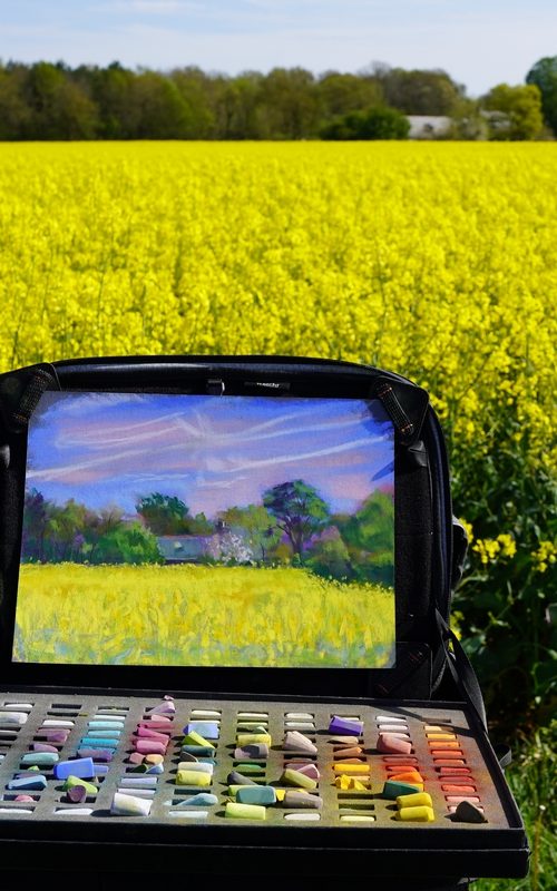 Avec l’arrivée du printemps, les jours sont de plus en plus ensoleillés apportant avec eux une température douce et agréable parfaite pour aller peindre en plein air. À cette époque de l’année, les cultures se parent de magnifiques champs de colza en pleine floraison. Les immenses étendues jaune vif parsèment nos jolies campagnes et inspirent à créer de somptueux tableaux.