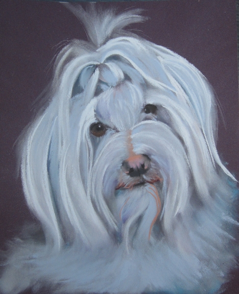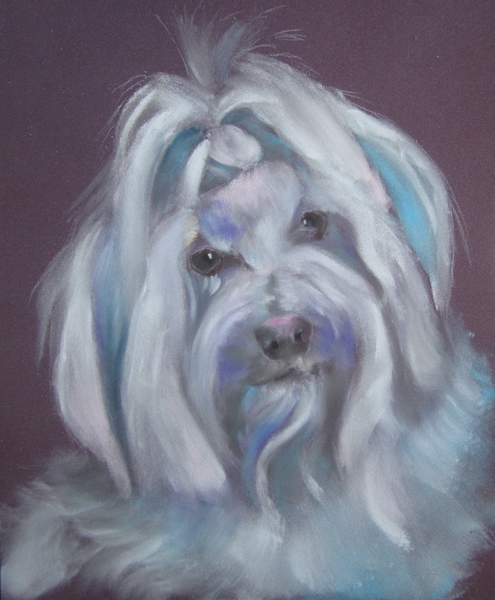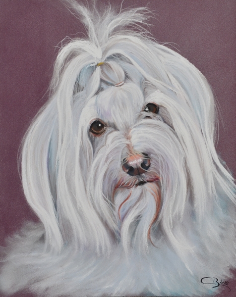 Aujourd’hui je vous présente le portrait de Kitana, une adorable chienne Coton de Tuléar que j’ai immortalisée aux pastels sur commande de sa maîtresse Christine. C’était l’occasion d’utiliser mes nouveaux pastels Schmincke ! Ce sont des pastels de très bonne qualité, et sur un chien blanc j’ai pu apprécier leurs nuances les plus claires.