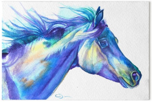 Je voulais transmettre un sentiment de liberté et de sérénité, par l’attitude du cheval, l’expression de son regard, et les couleurs majoritairement froides avec des touches de jaune et un rien de orange pour équilibrer.