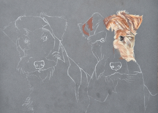 Comme elle m’a laissé choisir la couleur du papier, j’ai opté pour l’anthracite, qui fera ressortir des deux toutous à la robe claire. J’ai fais l’esquisse au crayon-pastel gris clair.