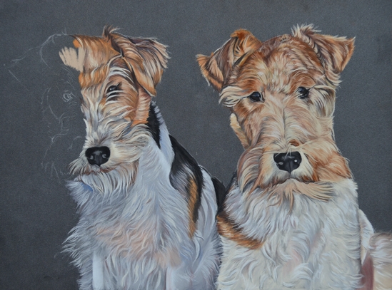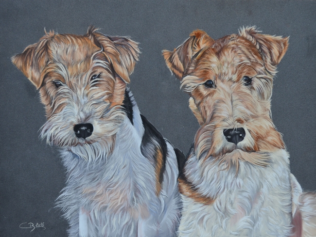 Des petits fox à poils durs ! L’une de mes races préférées, j’en avais un quand j’étais petite.. Alors forcément j’étais aux anges lorsque Marie-Paule m’a confié la réalisation du portrait de ses deux amours de chiennes Jade et Sonie !