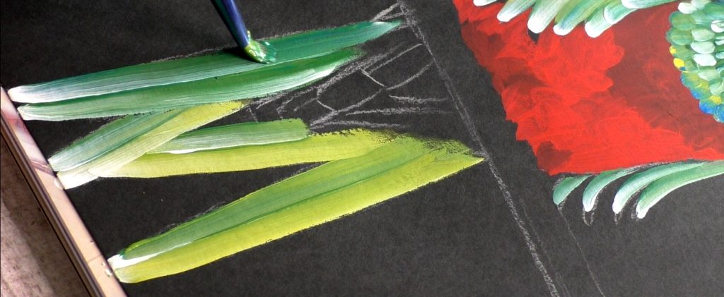 Création du plumage vert: Bleu primaire + Jaune japonais clair et pinceaux ronds pour imiter la forme d’une plume.