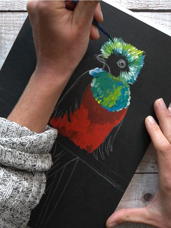 Nous nous retrouvons pour un nouveau tutoriel de gouache One Stroke sur papier noir. Cette fois-ci c’est un oiseau au plumage flamboyant qui est à l’honneur. Le Quetzal resplendissant possède un vert électrique de la tête jusqu’au bout des plumes de la queue avec des reflets turquoises métallisés et son abdomen se pare de rouge rubis. Ses plumes iridescentes changent de teintes selon l’intensité lumineuse perturbant la vision de ses prédateurs. Il vit en Amérique Centrale, principalement au Costa Rica qui joue un grand rôle dans sa conservation. C’est un oiseau très discret qui vit en altitude dans la haute canopée et qui se nourrit d’avocats.