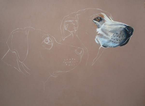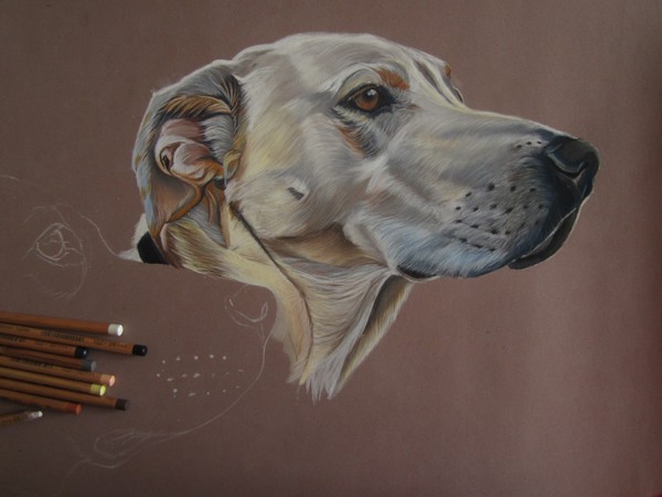 Le format choisi par Françoise est le 50*70cm, j’ai donc pu me faire plaisir sur les détails du pelage ! Au niveau des couleurs, il y a des endroits plus ou moins chauds mais globalement Gipsy tire sur le beige. Ce que j’aime bien, c’est le liseret lumineux sur son museau, son front et le dessus de la tête, qui font ressortir sa bouille sur ce papier.