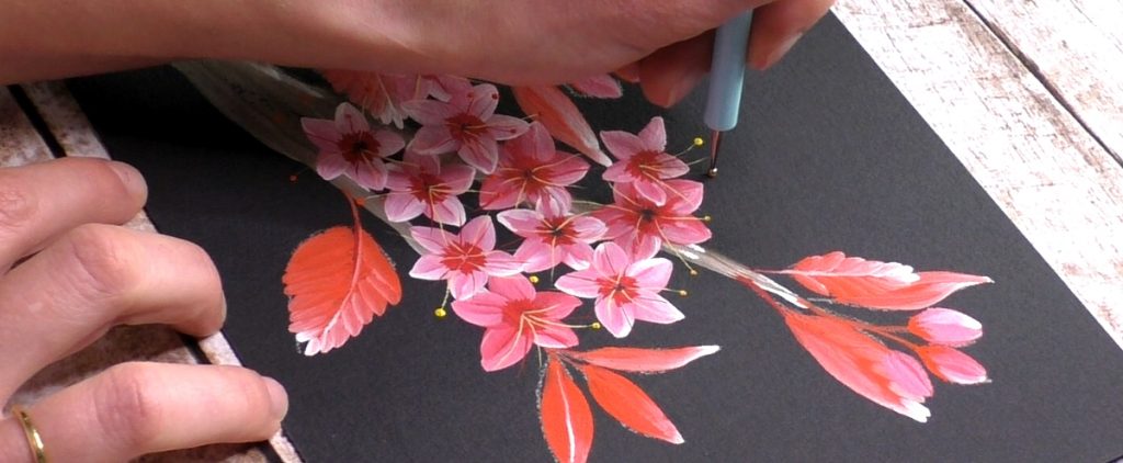 Cette peinture à la gouache représentant une petite branche avec ses quelques fleurs resplendissantes est l’occasion d’utiliser la technique du One stroke ( signifiant : un coup de pinceau) couplée à celle du dotting (stylet dont la pointe se termine par une boule et très répandu dans l’art du Mandala).