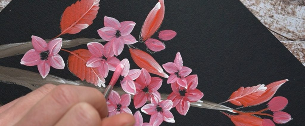 Les pétales ont plusieurs nuances de rose rompant ainsi la monotonie visuelle et suggérant que certaines fleurs peuvent être plus anciennes, plus lumineuses, plus ombragées par exemple. Le procédé est exactement le même que pour les feuilles : le pinceau sera déjà trempé dans le mélange de rose puis dans la peinture blanche. La peinture est appliquée en commençant par l’extrémité des pétales.
