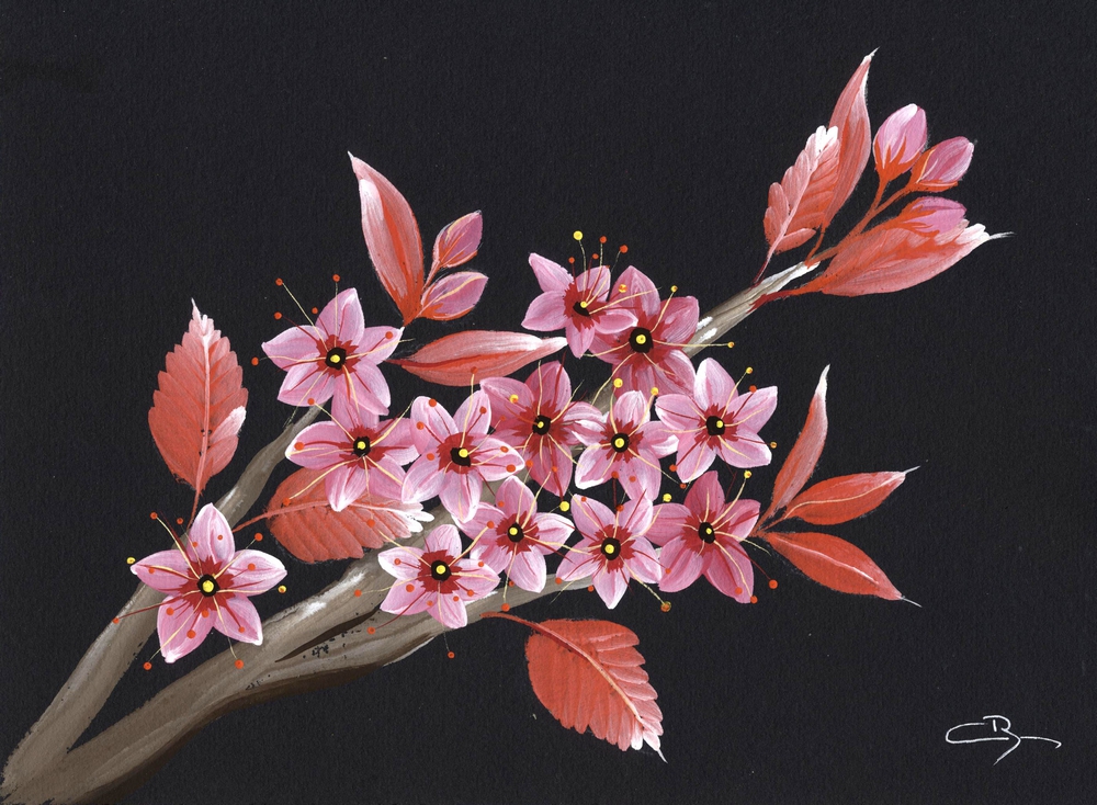 Rappel : La gouache est un médium opaque. Il est alors plus judicieux et facile de commencer par les éléments les plus en arrière-plan. Les fleurs couvriront donc sans soucis les branches et les feuilles déjà peintes.