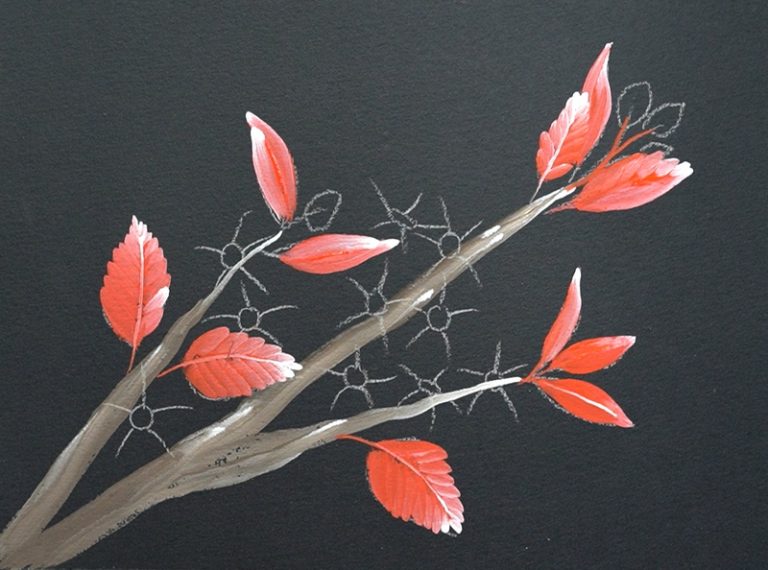 Les feuilles sont peintes en One stroke avec un mélange de rouge de Cadmium écarlate agrémenté d’un peu de rouge primaire. Le pinceau est d’abord trempé dans ce mélange puis seulement la pointe est imbibée de blanc pour que celui-ci se retrouve sur la bordure des feuilles et contraste avec le noir du papier.