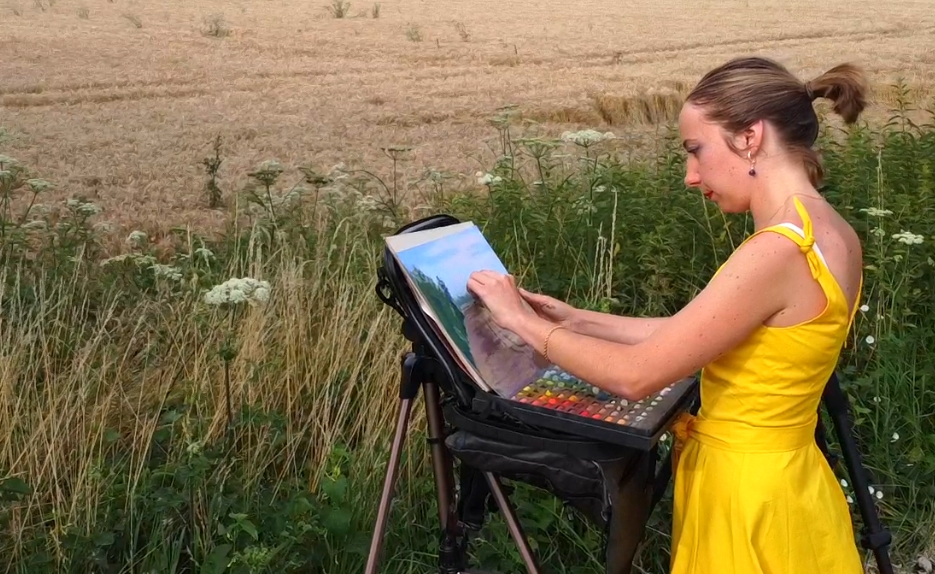 Je me suis installée devant un champ de blé ensoleillé (du moins… il l’était quand je me suis installée !) avec dans l’idée d’accorder le plus d’importance à deux choses :