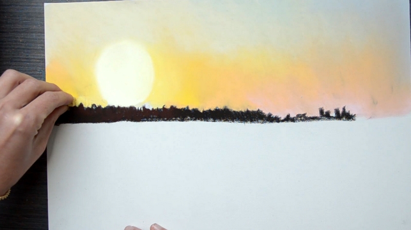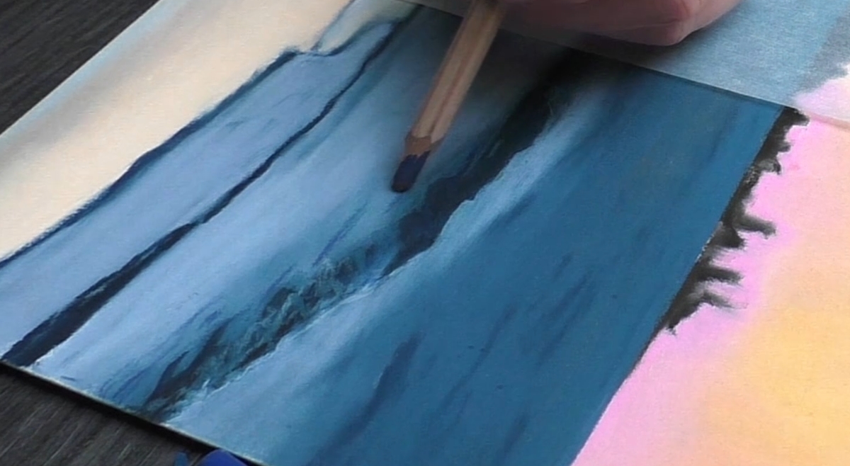 Peut-on faire des tableaux aux crayons pastels uniquement ? Typiquement, pour ce genre de tableau je trouve très dommage de se passer du confort et de l’intensité des bâtonnets. Il n’est pas impossible de créer ce type de paysage aux crayons, par contre le temps passé sera démultiplié car d’une part, remplir une grande zone au crayon est plus lent qu’au bâtonnet, et d’autre part, là où une seule couche de bâtonnets suffit, il en faudra plusieurs pour atteindre l’épaisseur nécessaire aux crayons.
