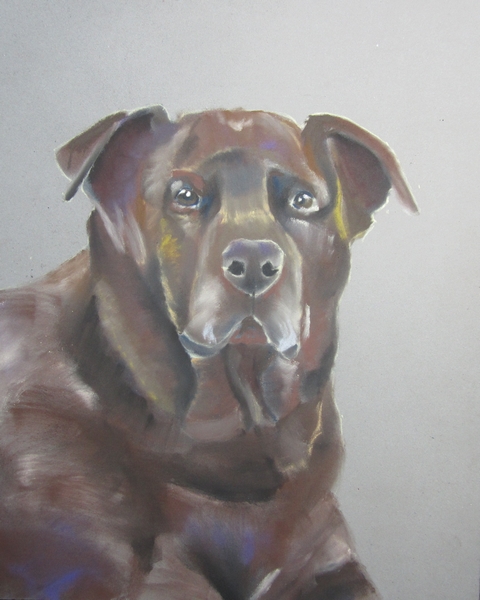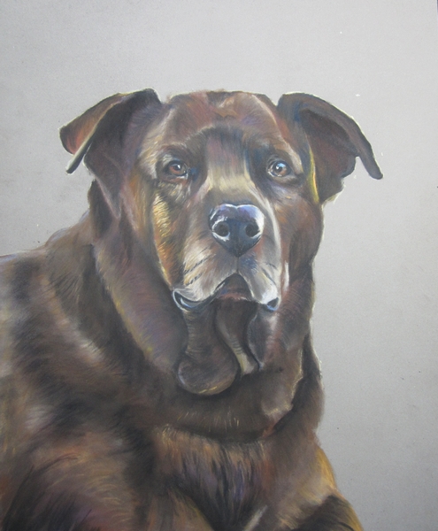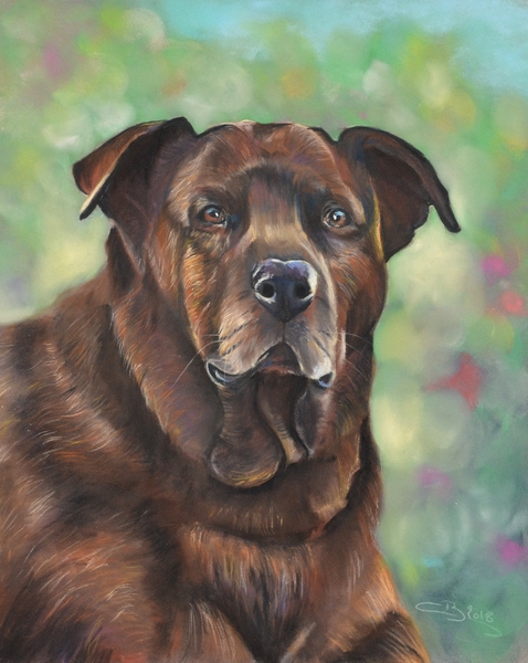 Stéphane m’a commandé le portrait de cette chienne de belle carrure, qui a une magnifique expression. Cette commande comprenait beaucoup de défis pour moi, à commencer par la robe d’Orka qui semblait différente sur chaque photo dont je disposais. La photo qui m’a servi de base pour son attitude était prise à bonne distance, et j’ai dû interpréter beaucoup de choses pour recréer un rendu réaliste et détaillé.
