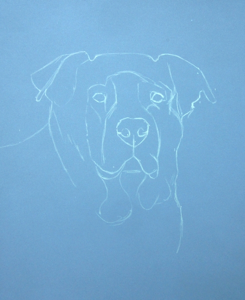 Je commence par une esquisse au crayon-pastel blanc sur Pastelmat gris foncé (il semble bleu sur l’image mais c’est à cause de la lumière du soir sur mon bureau).