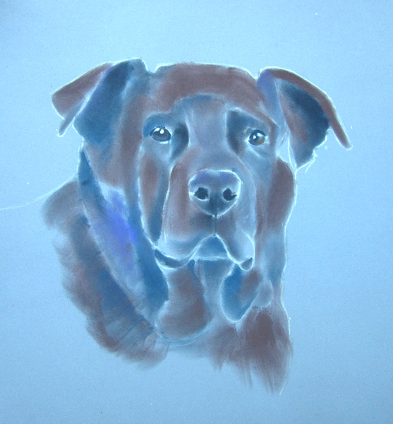 Une fois que mon arrière-plan est posé (aux PanPastel, voir la vidéo : faire un fond aux PanPastel) je me rends compte que je peux largement augmenter les contrastes pour que la belle Orka semble plus tridimensionnelle, et aussi utiliser plus de roux car sa robe semblait plus colorée sur d’autres clichés. J’utilise à nouveau les bâtonnets Unison, qui sont intenses à souhait et me permettent de foncer considérablement certaines zones (sous les oreilles, dans les plis, etc.).