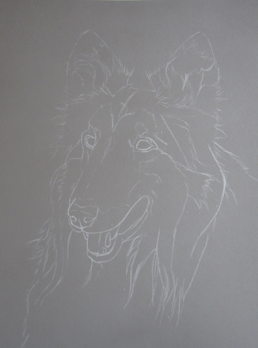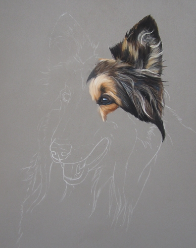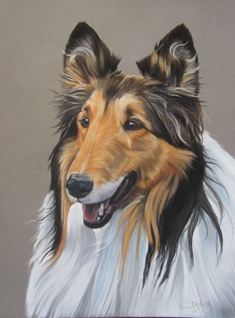 Sonia m’a passé commande du portrait en hommage à Santana, le superbe Colley de son amie Nathalie. Certaines personnes sont réticentes à passer commande si je ne suis pas en mesure de leur montrer un exemple de la race de leur chien, alors je remercie tout particulièrement Sonia pour sa confiance.