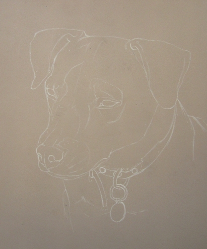 Comme toujours, je commence par la zone de droite. Les oreilles sont un peu plus foncées que le reste de la tête, comme souvent chez les chiens de cette couleur. Toute cette zone est dans l’ombre, la lumière venant de la droite. Seul le dos est illuminé car il passe derrière l’oreille, je le ferai donc en blanc.