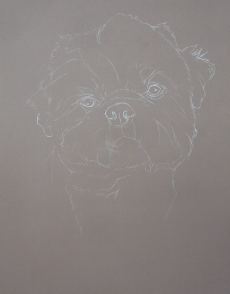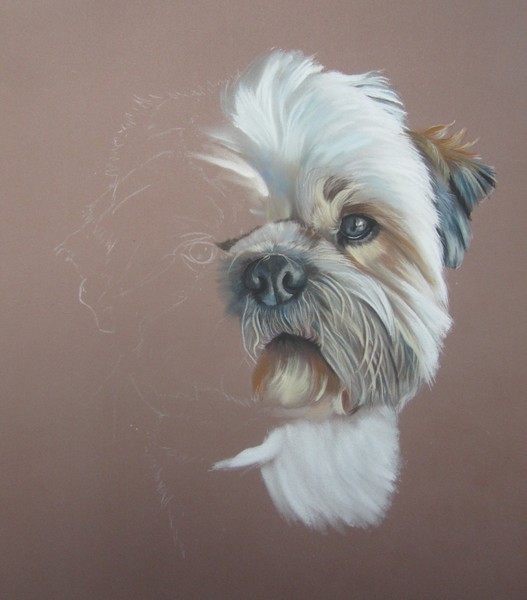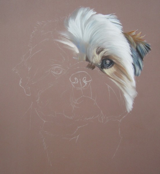En réalisant ma sous-couche aux PanPastel j’ai pu constater à quel point leur douceur apporte un vrai avantage pour le poil soyeux comme celui du Shih-Tzu. J’ai pu créer une sous-couche toute douce, parfaite pour accueillir des détails plus fins réalisés aux bâtonnets et crayons-pastels.