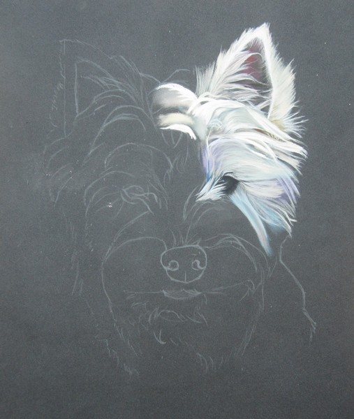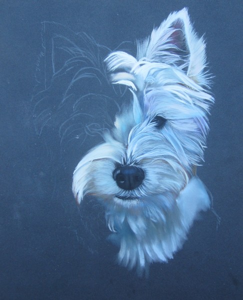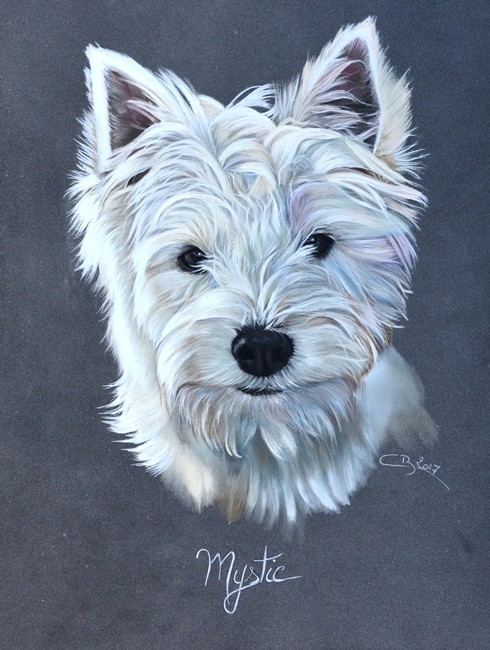 Aujourd’hui j’ai le plaisir de vous présenter le portrait de Mystic, la petite chienne Westie de Catherine. J’avais eu le plaisir d’immortaliser ses trois autres westies au pastel en 2016, la petite dernière n’avait alors pas encore rejoint la tribu !