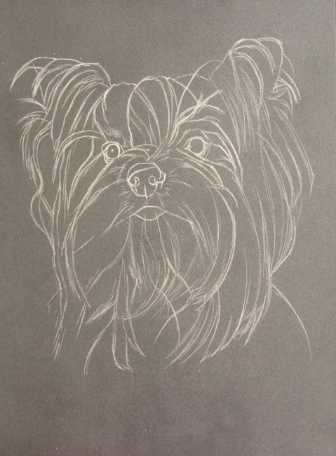 La photo de Chimène qui m’a servie de modèle me plait beaucoup car elle est très légèrement contre-plongée, ce qui la met très bien en valeur. Quand vous avez un petit chien, il peut être très intéressant de le faire monter sur une table pour le photographier car vous obtenez ainsi un angle parfait pour un portrait.
