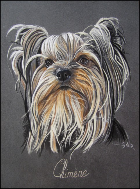 Coucou mes petits lecteurs, aujourd’hui je vous présente le portrait de la belle Chimène, une Yorkshire terrier à la crinière de rêve et au regard pétillant de malice ! Merci à Rosemarie qui m’a confié cette petite puce. Comme vous pouvez l’imaginer, les longs poils du York demandent beaucoup de temps et d’attention mais ce n’est que du plaisir.