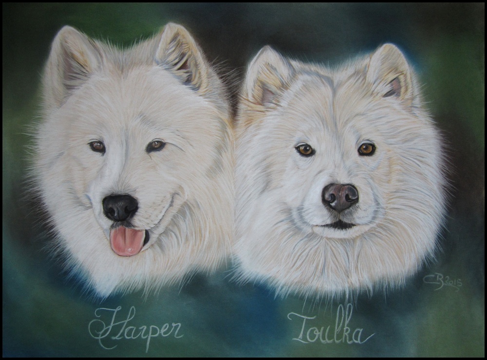 Un joli couple de Samoyèdes pour ce tableau aux pastels secs : Ioulka et Harper. Bernadette m’a commandé cette oeuvre pour l’offrir à son mari le jour de son anniversaire.