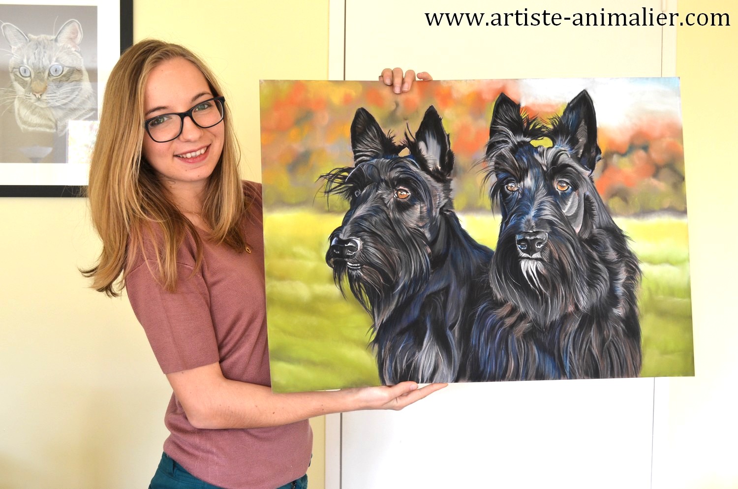 Je suis très admirative de ton travail… Je ne suis pourtant pas très branchée peinture animalière chien et chat, mais là tes œuvres sont bluffantes ! Ces magnifiques scottisch nous le prouvent encore… Et j’adore ton fond. Je suis très intéressée pour le petit film de la réalisation du fond… Cela complétera tes explications pour les détails de pelage. J’adore… Merci