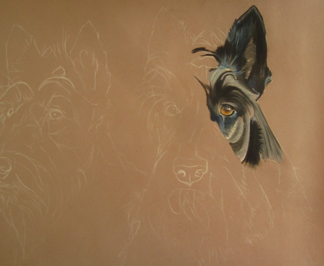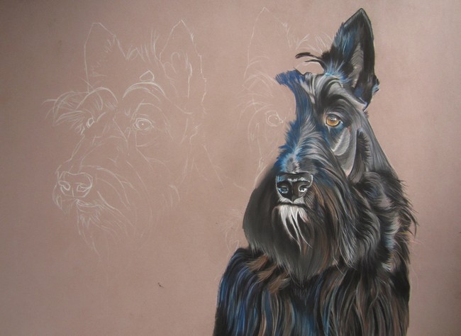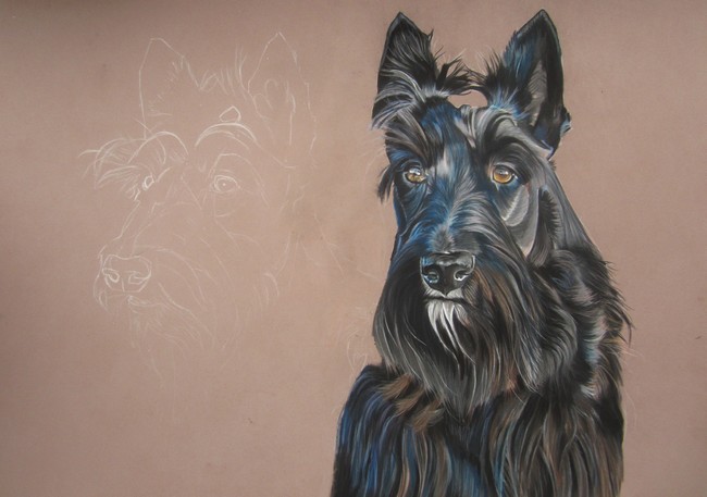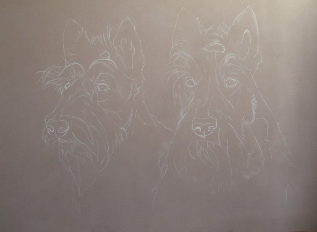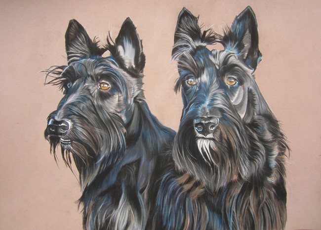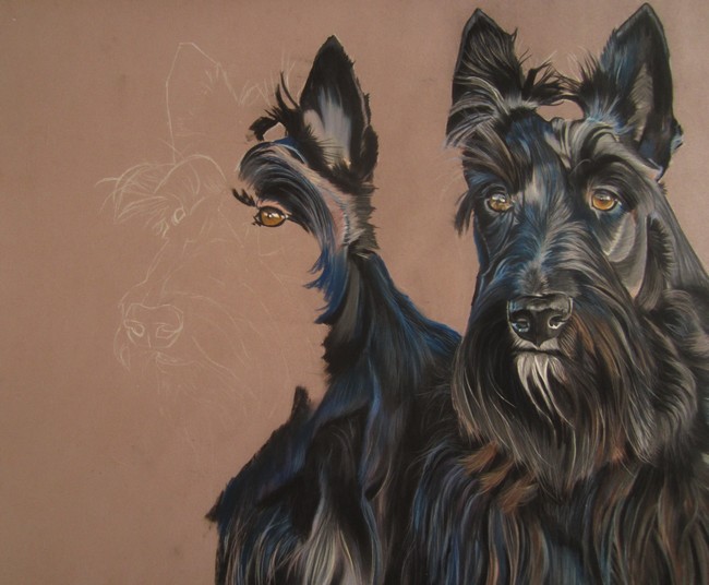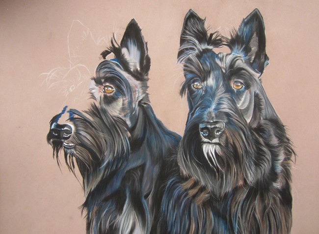 Après avoir fait un tableau représentant 4 Scottish terriers aux pastels plus tôt en 2015, j’ai eu le grand plaisir de réaliser un autre tableau pour Marie-Christine avec ce mignon petit couple de toutous nommés Facebook et Elrich.