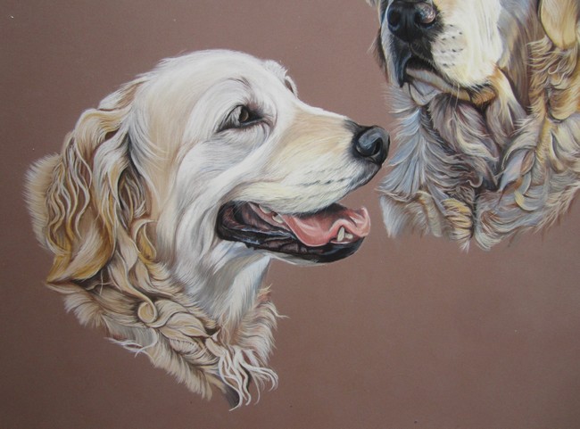 Si vous aimez les Golden Retriever il y en a pas mal sur mon blog, par exemple récemment le beau First sur un autre triple portraits de chiens, ou encore l’adorable Babouche, une chienne Golden retriever aux pastels en compagnie de sa copine Beagle Elie.
