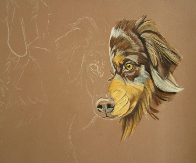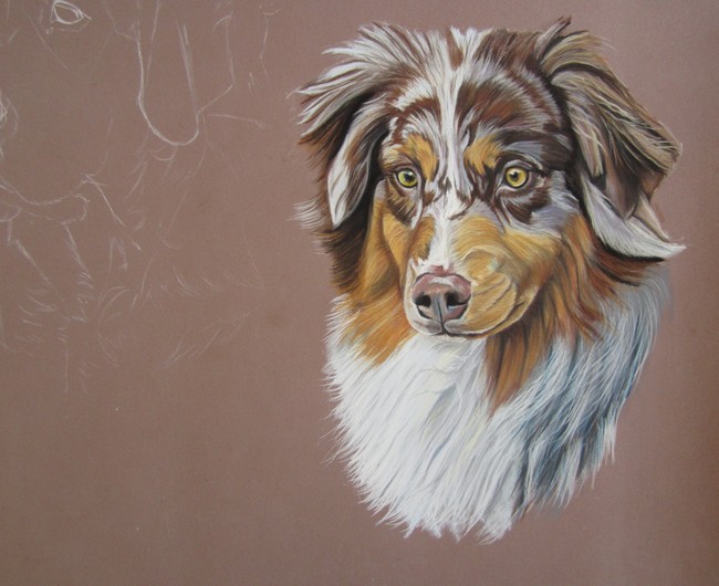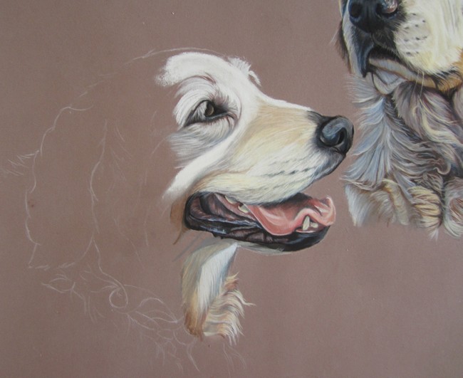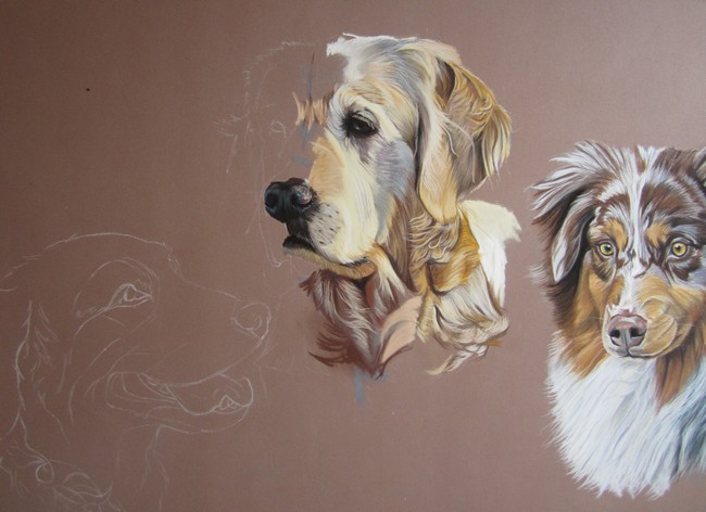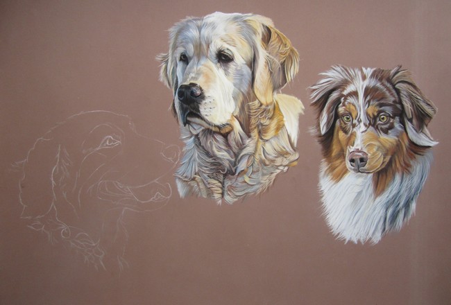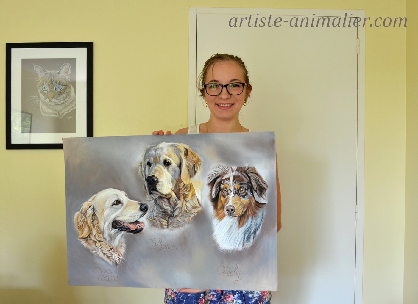 Voici une nouvelle composition aux pastels secs avec les trois adorables chiennes de Christine, cadeau qu’elle a décidé d’offrir à son époux pour son anniversaire ! Il y a les deux Golden Retriever Uxanne et Baïne, et puis la belle Feeby, le Berger australien.